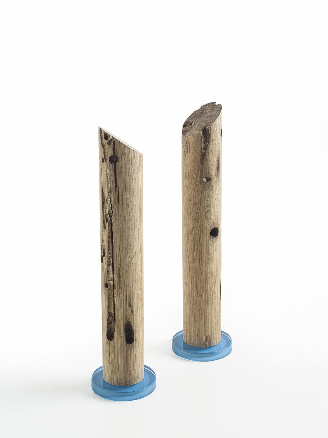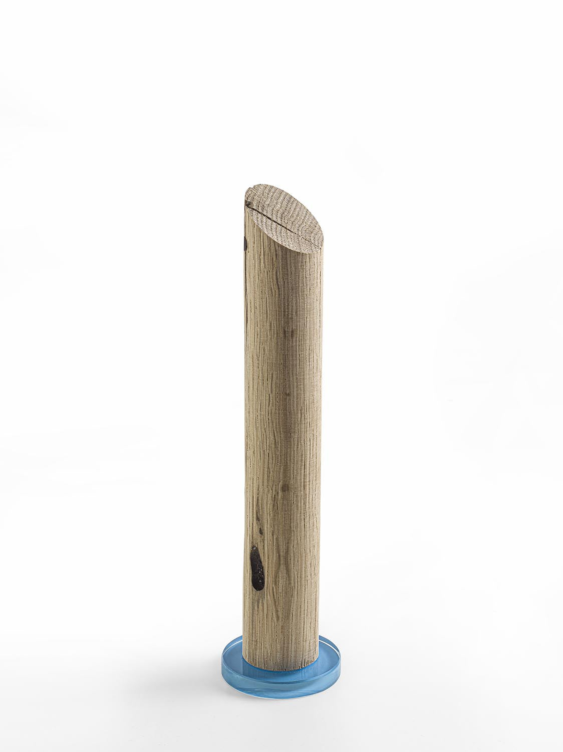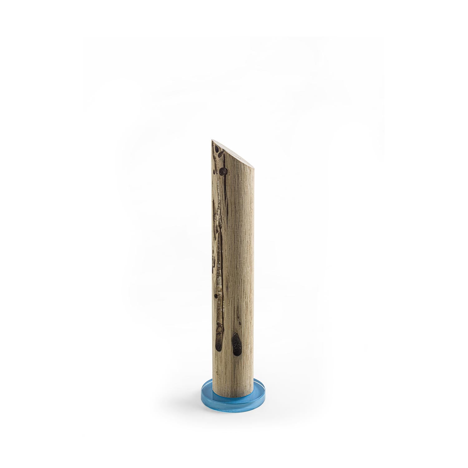 Complemento d’arredo in Briccola con basamento in vetro laccato color azzurro. Il design si ispira ad un celebre elemento della Laguna, il palo che ne traccia la navigazione.
