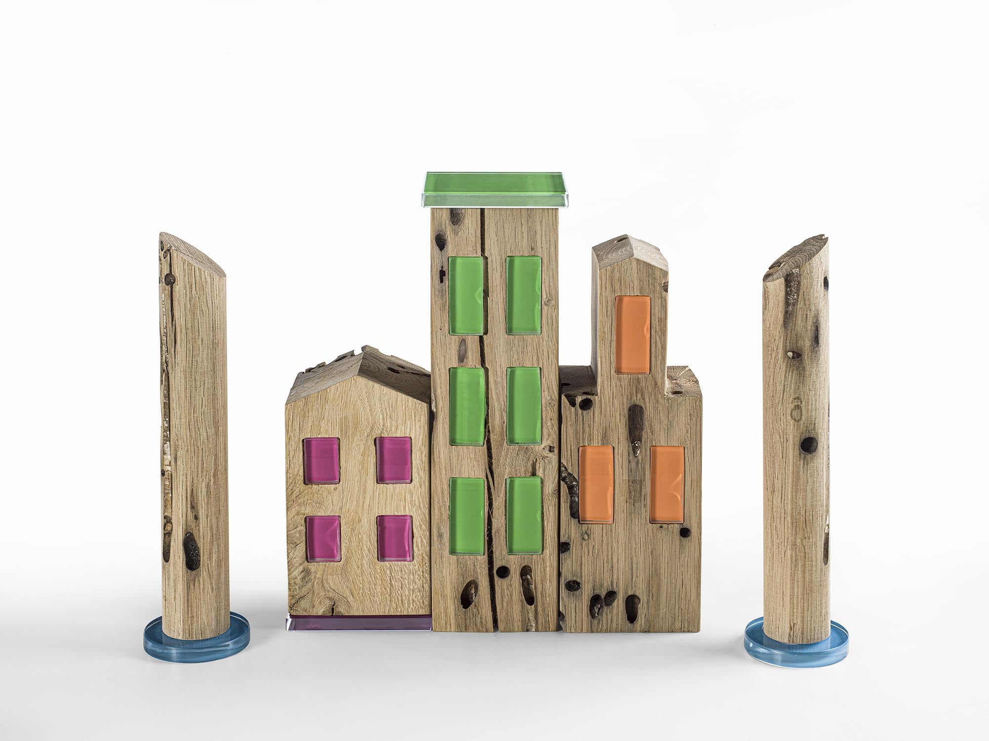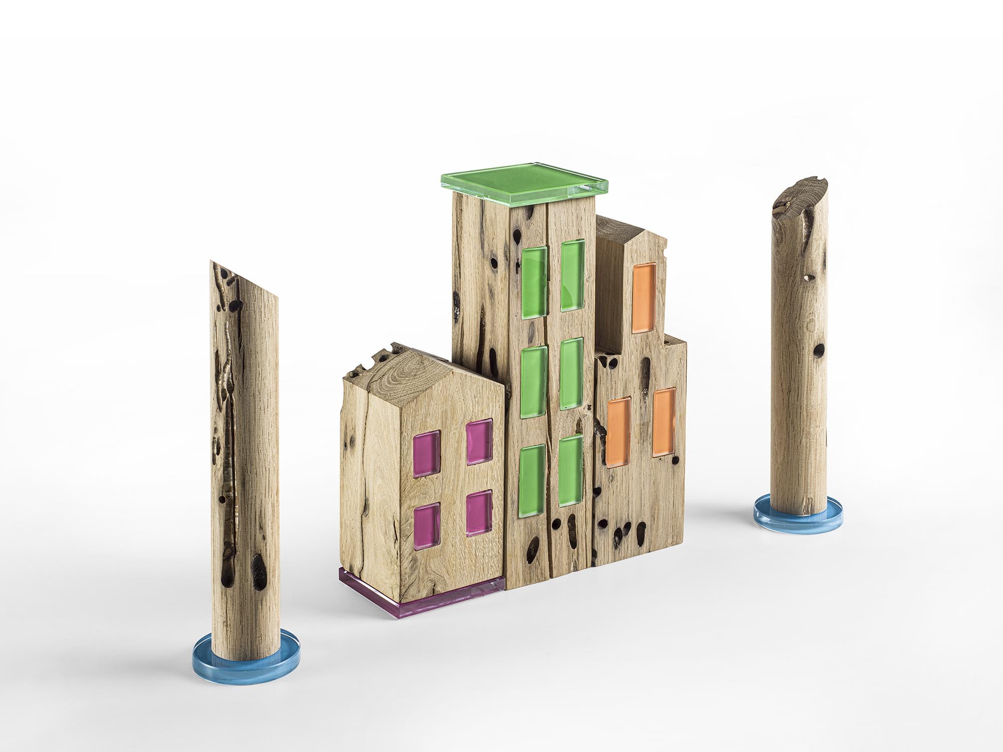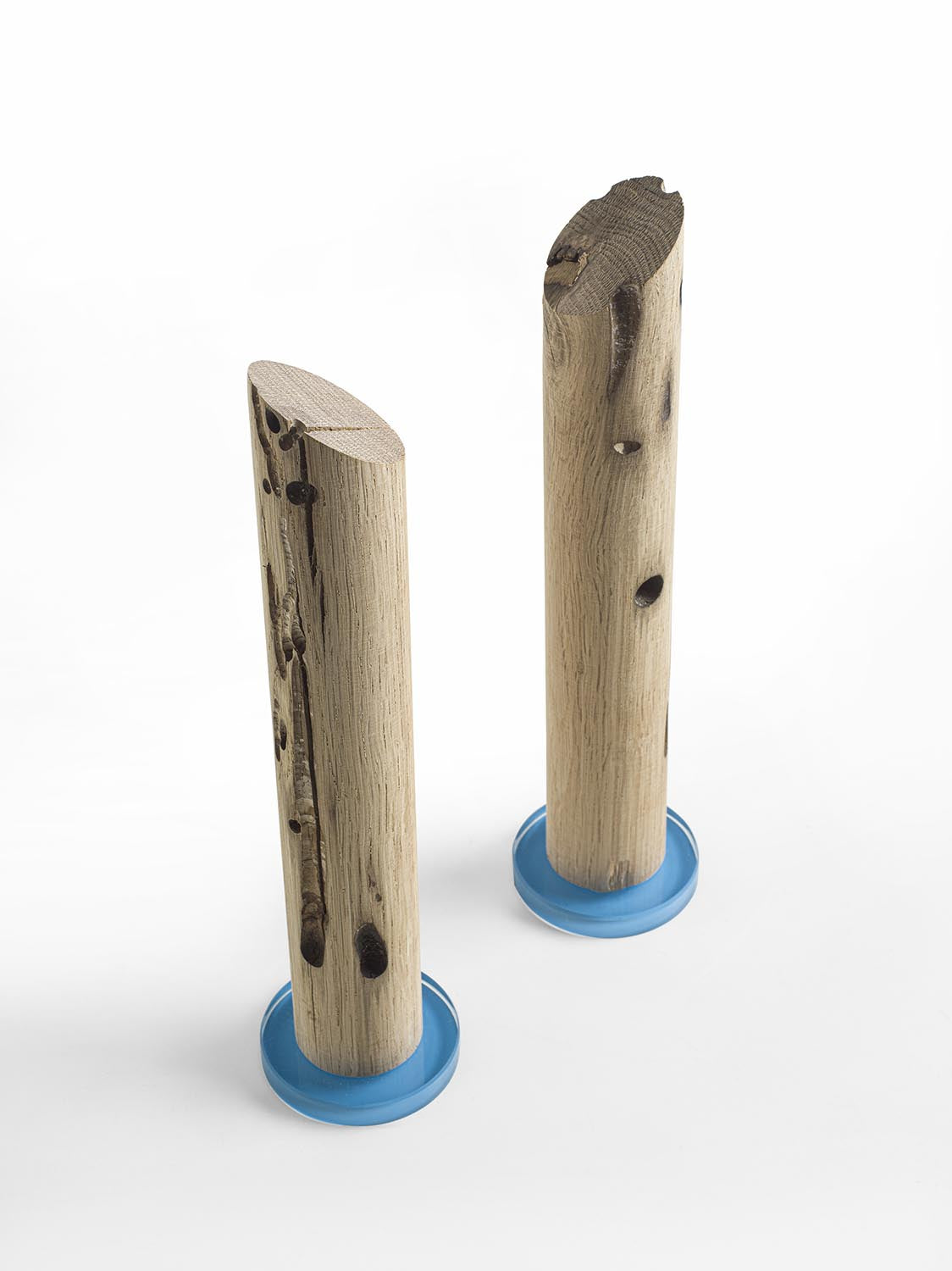 Complemento d’arredo in Briccola con basamento in vetro laccato color azzurro. Il design si ispira ad un celebre elemento della Laguna, il palo che ne traccia la navigazione.